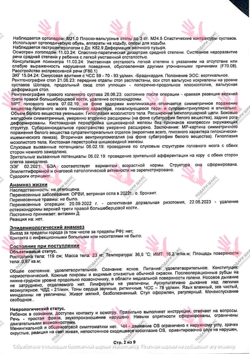 20 сентября 2022 года Даниилу была проведена селективная дорсальная ризотомия для снижения мышечного тонуса в нижних конечностях. Операция прошла успешно. Теперь только интенсивная реабилитация поможет укрепить мышцы, приобрести новые навыки и предотвратить возвращение гипертонуса.