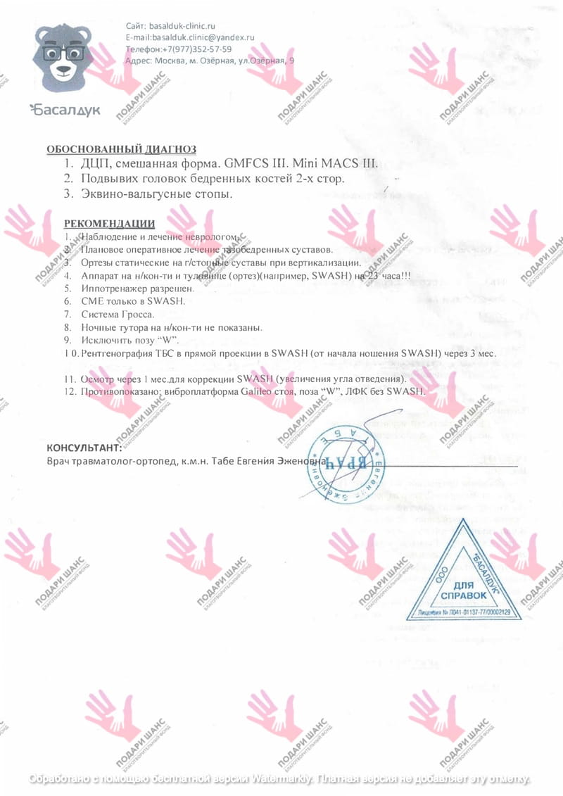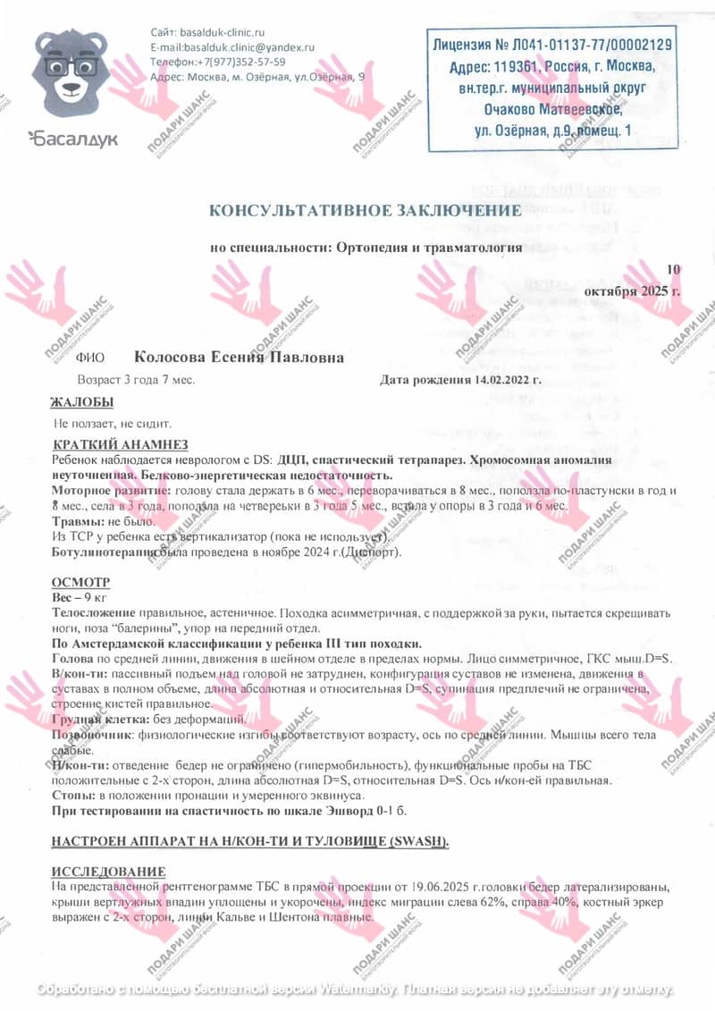 Диагноз ДЦП был официально подтвержден в Национальном медицинском исследовательском центре здоровья детей в Москве. Генетический анализ не выявил каких-либо аномалий.