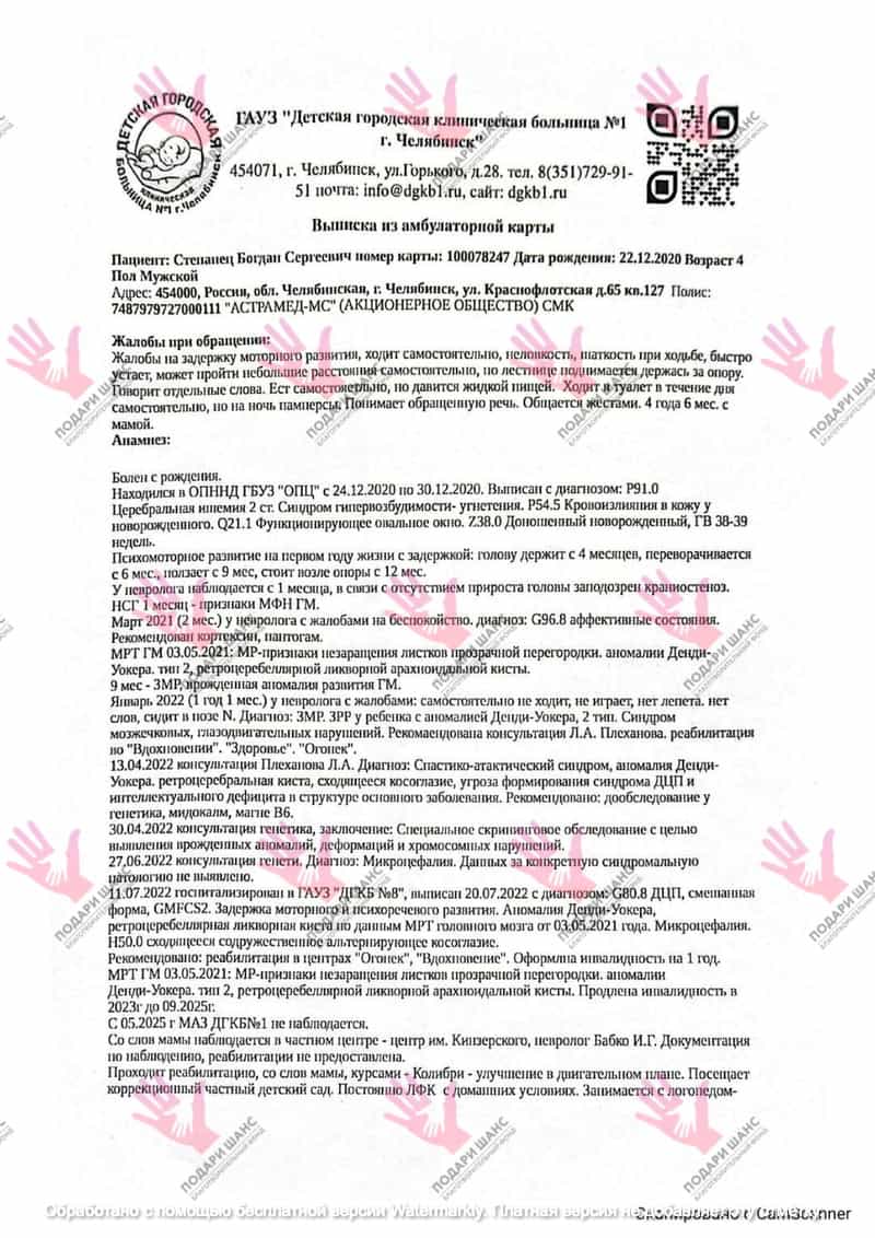 После МРТ головного мозга всё стало понятно: перенесённая инфекция и гипоксия серьёзно повредили мозг ребенка. У Богдана недоразвит мозжечок. В возрасте 1 года 8 месяцев ему поставили диагноз - ДЦП, смешанная форма.