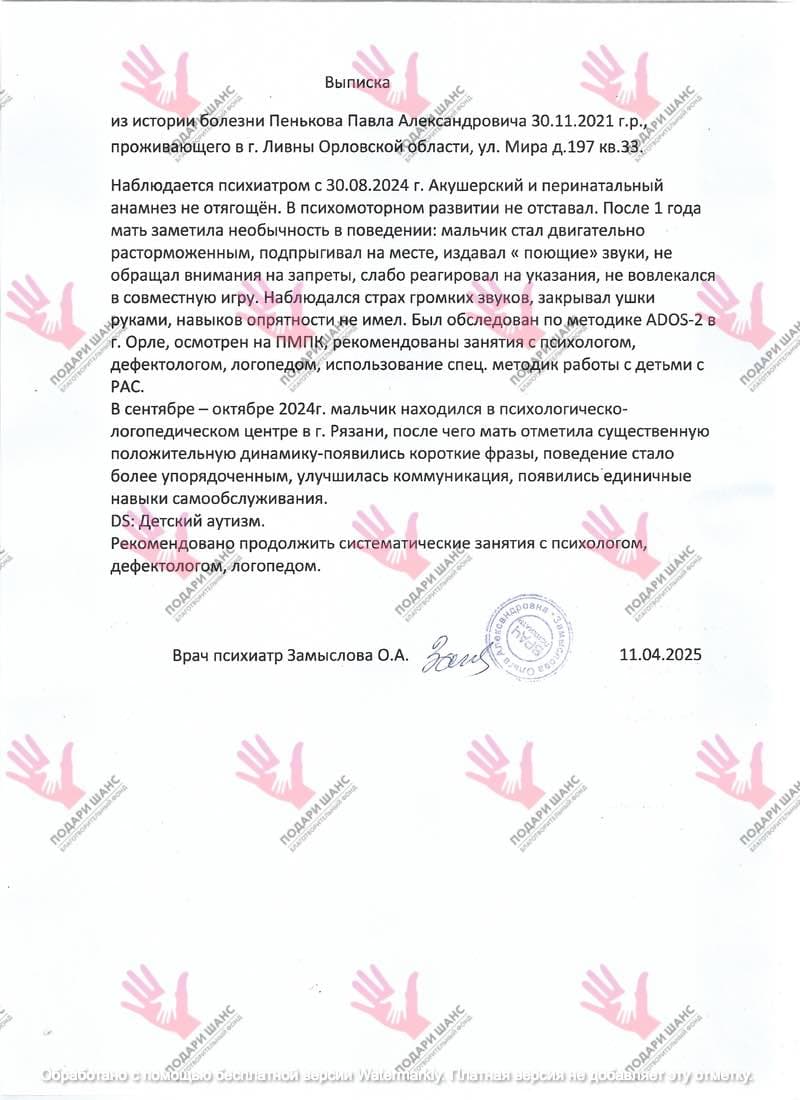 Я обращаюсь к вам, добрые люди, с просьбой о помощи. Помогите моему Пашеньке получить шанс на возможность учиться, общаться, чувствовать себя частью этого мира. Каждый ваш взнос, даже самый маленький, станет для нас шагом к выздоровлению».