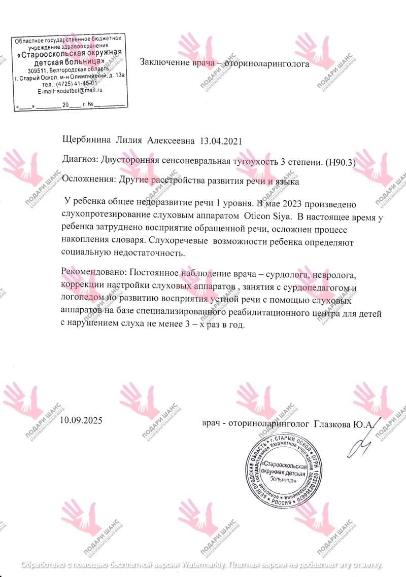 Результаты проверки слуха стали для семьи настоящим ударом. У Лилии диагностировали двустороннюю нейросенсорную тугоухость III степени. Этот диагноз прозвучал как приговор. По рекомендации сурдолога, девочке подобрали слуховые аппараты.