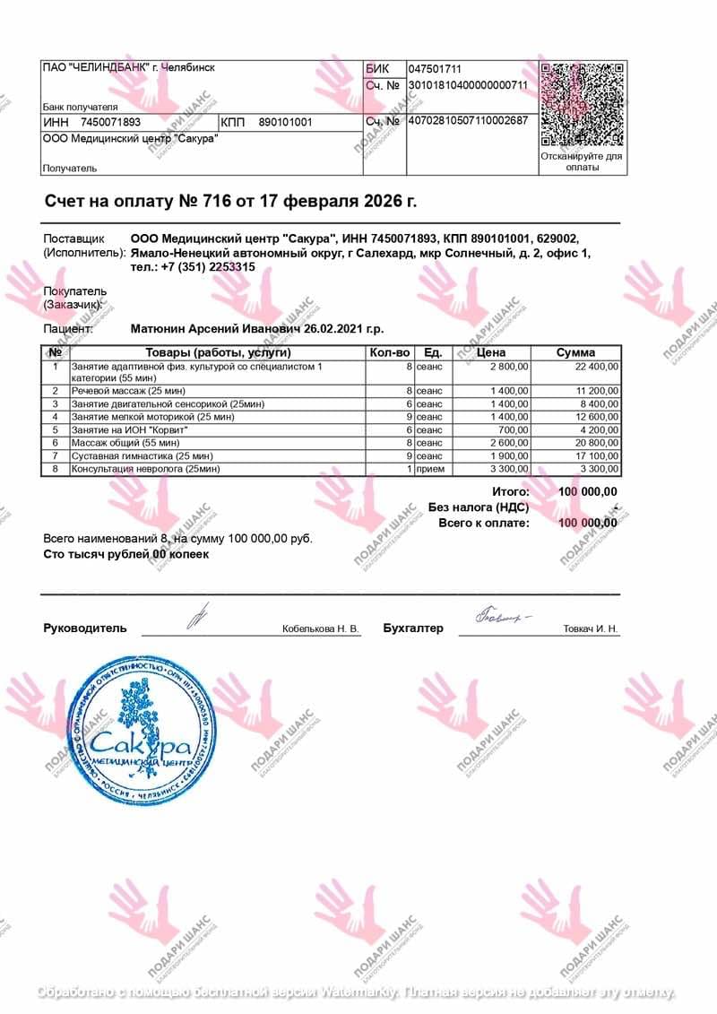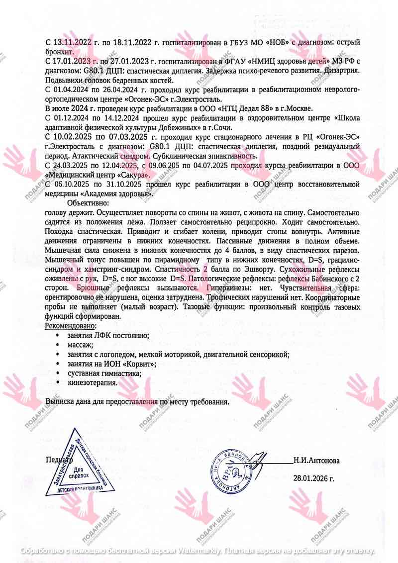 Реабилитация стала для семьи образом жизни, и она дает отличные результаты. Но постоянное лечение требует больших финансовых вложений. В семье работает только папа, и оплатить очередной курс в центре «Сакура» самостоятельно им не под силу. Помощь нужна для оплаты курса ЛФК, массажа, занятий с логопедом, нейропсихологом и специальной гимнастики в МЦ «Сакура».