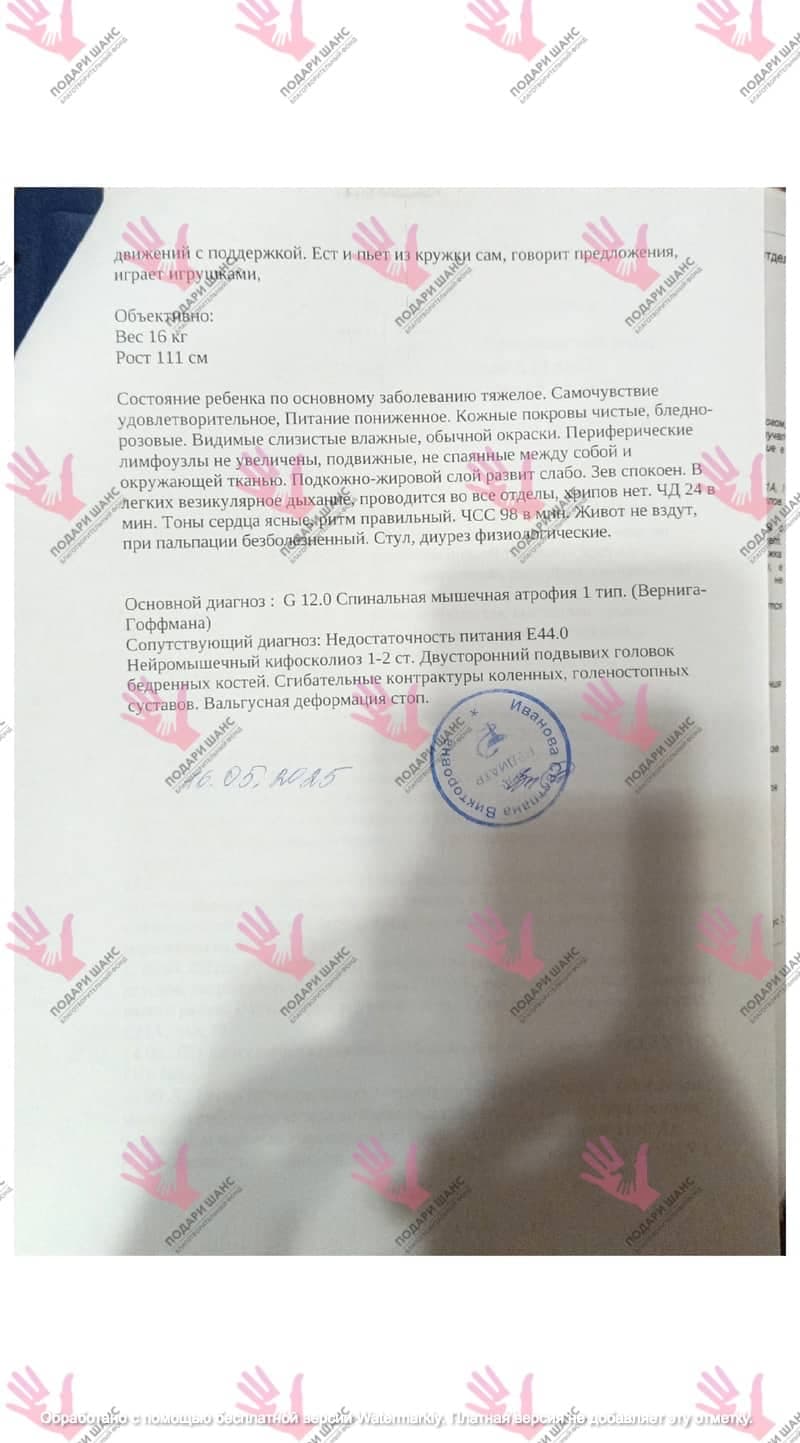 Только после длительных обследованийи генетического анализа был поставлен точный диагноз:спинально-мышечная атрофия (СМА) 1 типа - редкое и тяжёлое генетическое заболевание, при котором мышцы постепенно слабеют и теряют способность работать.