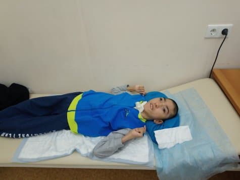 Сейчас ребенку 11 лет. Он не держит голову, не сидит, питается через гастростому, дышит через трахеостомическую трубку, не говорит, самостоятельные движения делать не может, слабо видит. Его мучают эпилептические приступы и дистонические атаки. С помощью медикаментозной терапии врачам частично удалось купировать приступы, тем самым облегчить жизнь мальчику.