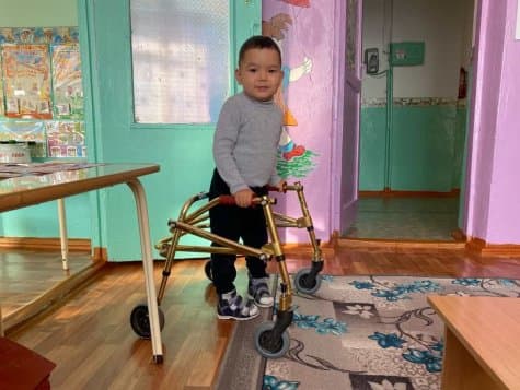Дархану купили ходунки для ходьбы, аппараты на коленный сустав, начали активно подключать занятия со специалистами по АФК. Сейчас Дархан встает на высокие колени, и стоит самостоятельно до минуты.